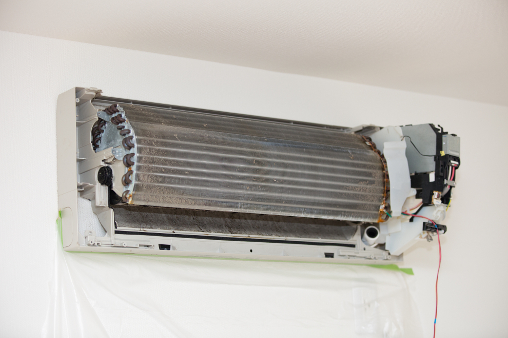 Otwarty klimatyzator ścienny w trakcie naprawy serwisowej.